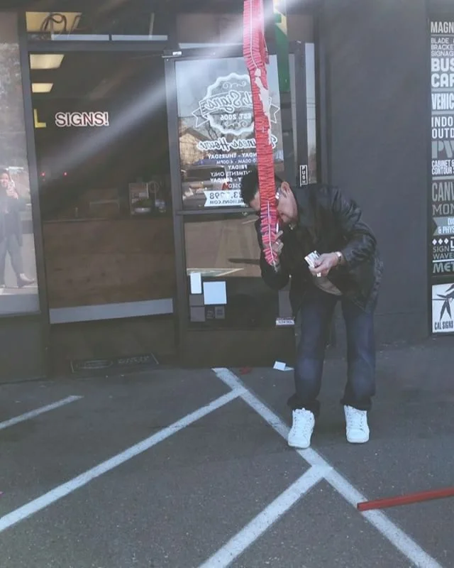 Illuminated front-lit white channel letters mounted on top of a red expanded backer raceway and banner. We also did Yang Kee Dumpling in Roseville!